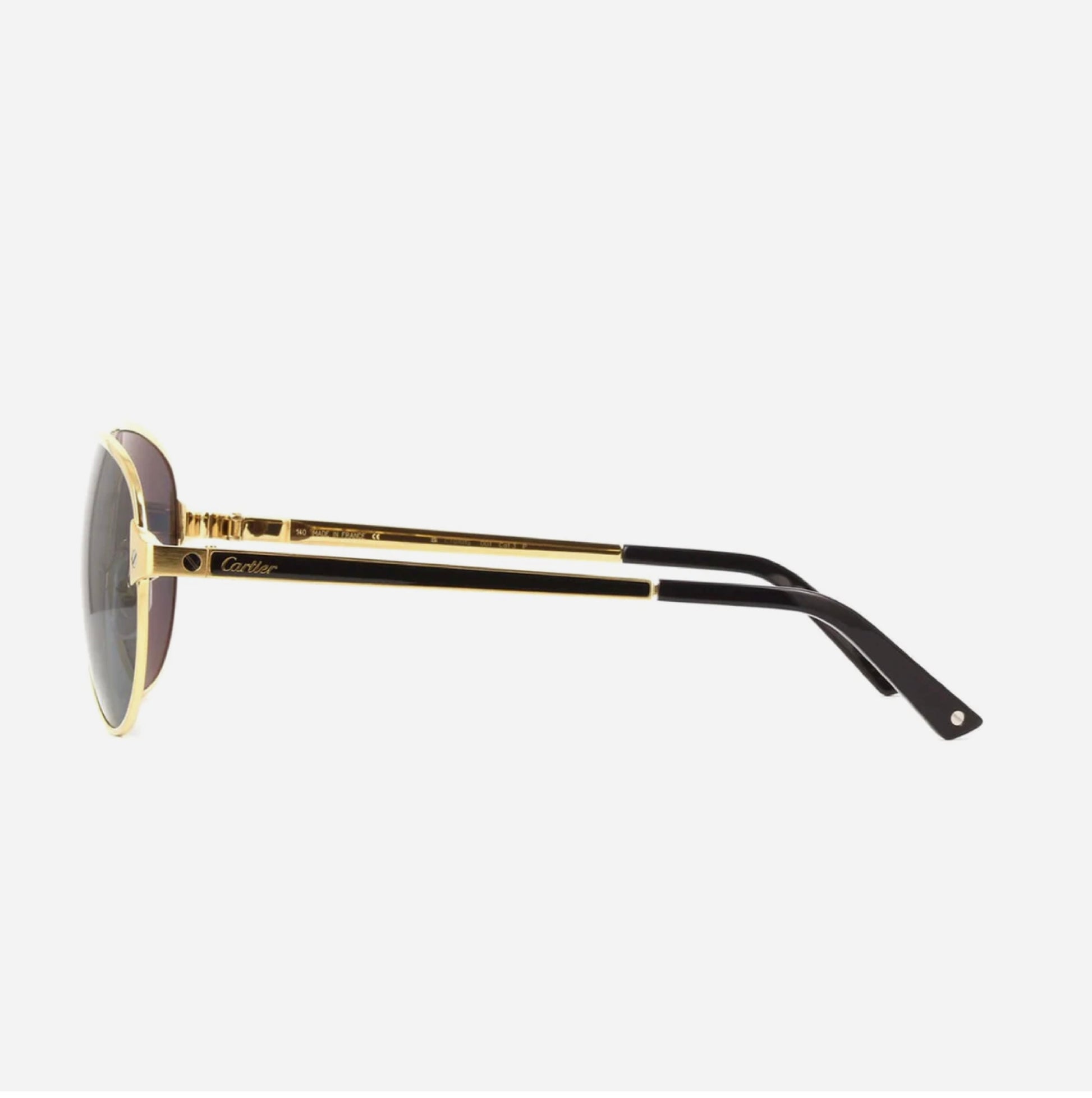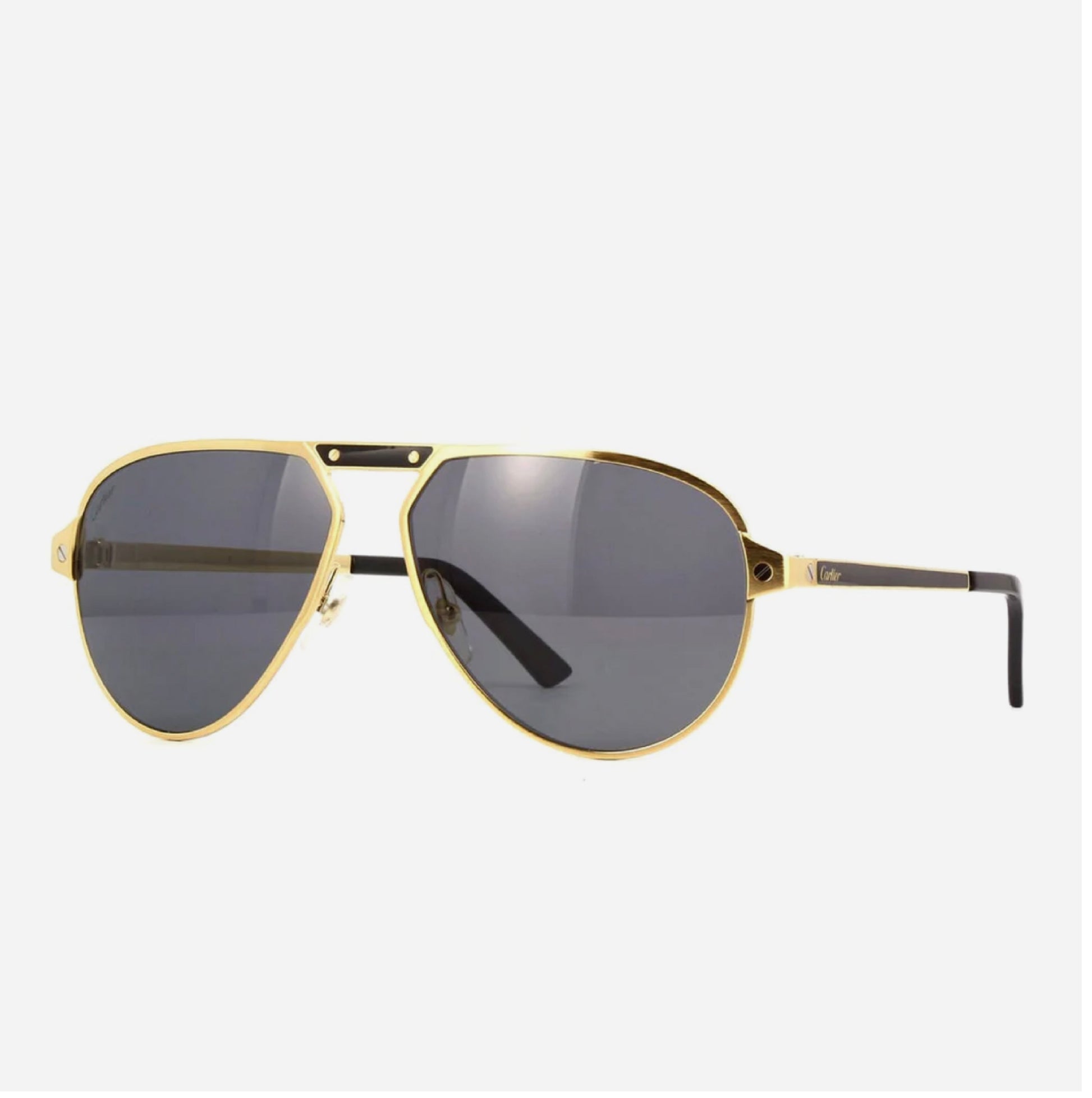 This aviator Cartier sunglass comes in shiny brushed gold with a black frame with grey polarised lenses.